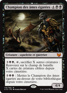 | Rules | , , Sacrifice X other creatures: Return X target creature cards from your graveyard to the battlefield. : Put Champion of Stray Souls on top of your library from your graveyard. |