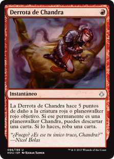 | Rules | Chandra's Defeat deals 5 damage to target red creature or red planeswalker. If that permanent is a Chandra planeswalker, you may discard a card. If you do, draw a card. |