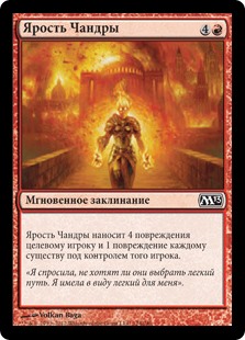 | Rules | Chandra's Fury deals 4 damage to target player or planeswalker and 1 damage to each creature that player or that planeswalker's controller controls. |