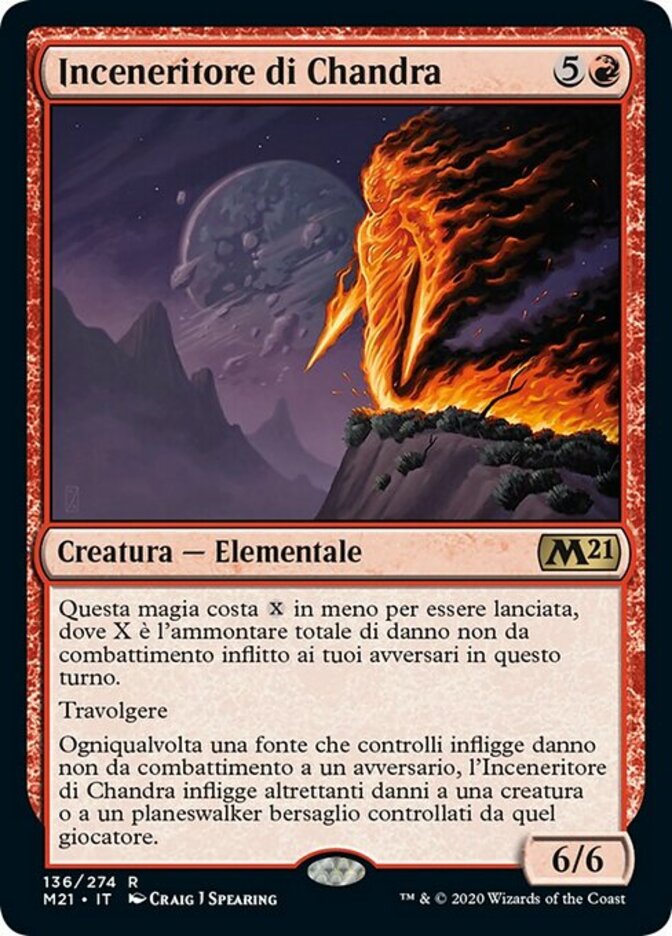 | Rules | This spell costs less to cast, where X is the total amount of noncombat damage dealt to your opponents this turn. Trample Whenever a source you control deals noncombat damage to an opponent, Chandra's Incinerator deals that much damage to target creature or planeswalker that player controls. |