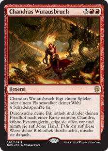 | Rules | Chandra's Outburst deals 4 damage to target player or planeswalker. Search your library and/or graveyard for a card named Chandra, Bold Pyromancer, reveal it, and put it into your hand. If you search your library this way, shuffle. |