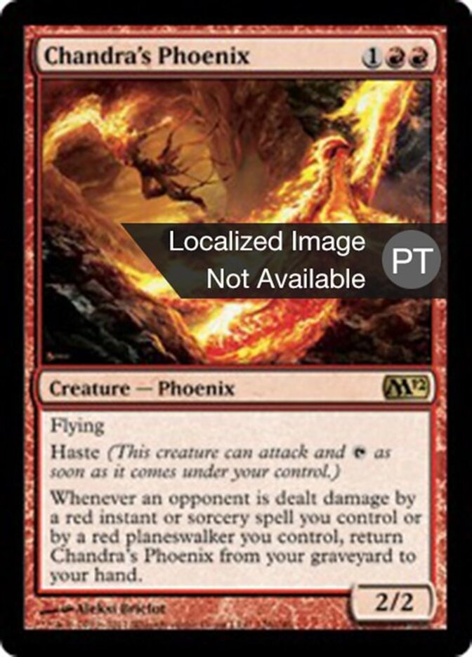 | Rules | Flying Haste (This creature can attack and as soon as it comes under your control.) Whenever an opponent is dealt damage by a red instant or sorcery spell you control or by a red planeswalker you control, return Chandra's Phoenix from your graveyard to your hand. |
