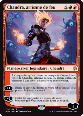 | Rules | Whenever one or more loyalty counters are removed from Chandra, Fire Artisan, she deals that much damage to target opponent or planeswalker. +1: Exile the top card of your library. You may play it this turn. −7: Exile the top seven cards of your library. You may play them this turn. |