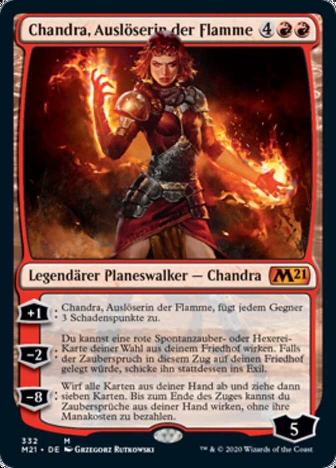 | Rules | +1: Chandra, Flame's Catalyst deals 3 damage to each opponent. −2: You may cast target red instant or sorcery card from your graveyard. If that spell would be put into your graveyard this turn, exile it instead. −8: Discard your hand, then draw seven cards. Until end of turn, you may cast spells from your hand without paying their mana costs. |