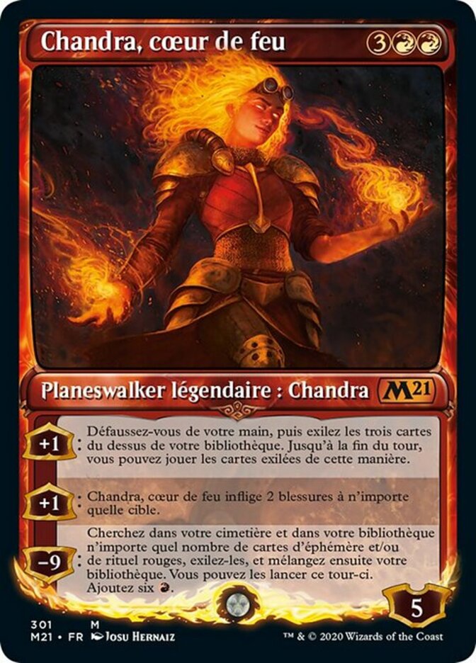 | Rules | +1: Discard your hand, then exile the top three cards of your library. Until end of turn, you may play cards exiled this way. +1: Chandra, Heart of Fire deals 2 damage to any target. −9: Search your graveyard and library for any number of red instant and/or sorcery cards, exile them, then shuffle. You may cast them this turn. Add six . |