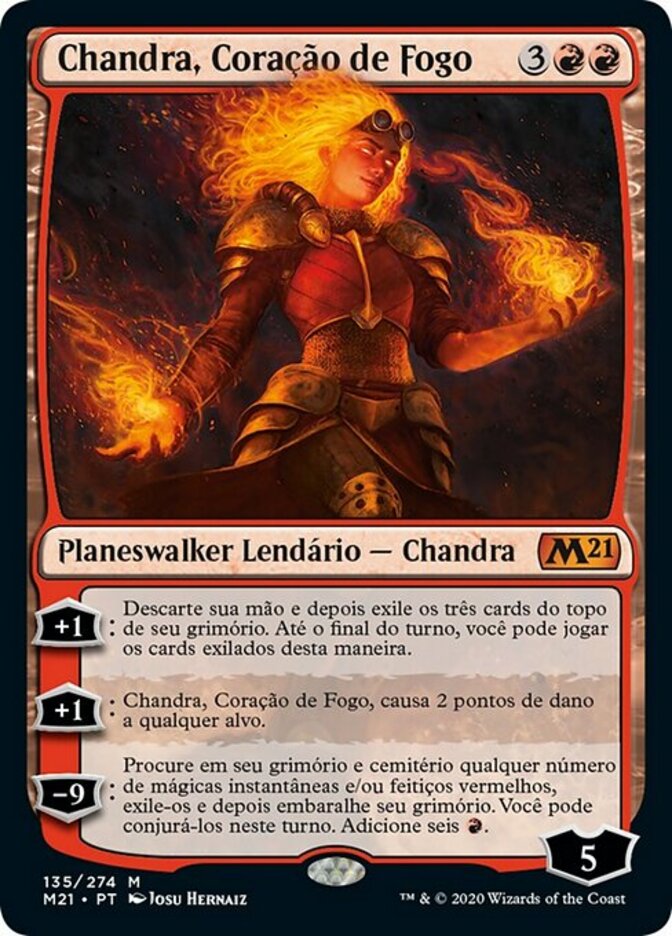 | Rules | +1: Discard your hand, then exile the top three cards of your library. Until end of turn, you may play cards exiled this way. +1: Chandra, Heart of Fire deals 2 damage to any target. −9: Search your graveyard and library for any number of red instant and/or sorcery cards, exile them, then shuffle. You may cast them this turn. Add six . |