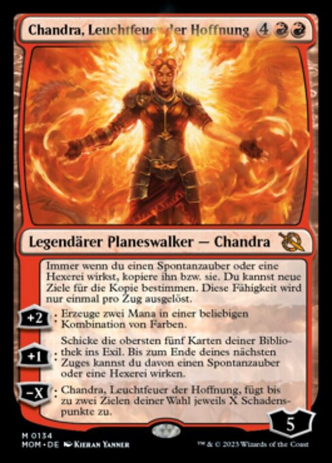 | Rules | Whenever you cast an instant or sorcery spell, copy it. You may choose new targets for the copy. This ability triggers only once each turn. +2: Add two mana in any combination of colors. +1: Exile the top five cards of your library. Until the end of your next turn, you may cast an instant or sorcery spell from among those exiled cards. −X: Chandra, Hope's Beacon deals X damage to each of up to two targets. |