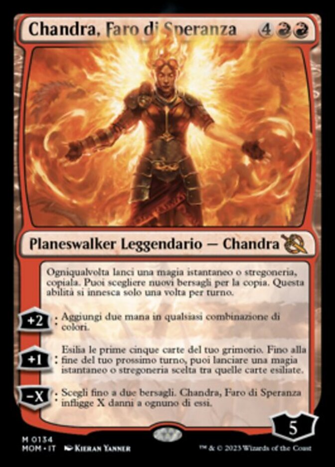 | Rules | Whenever you cast an instant or sorcery spell, copy it. You may choose new targets for the copy. This ability triggers only once each turn. +2: Add two mana in any combination of colors. +1: Exile the top five cards of your library. Until the end of your next turn, you may cast an instant or sorcery spell from among those exiled cards. −X: Chandra, Hope's Beacon deals X damage to each of up to two targets. |