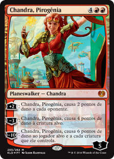 | Rules | +2: Chandra, Pyrogenius deals 2 damage to each opponent. −3: Chandra, Pyrogenius deals 4 damage to target creature. −10: Chandra, Pyrogenius deals 6 damage to target player or planeswalker and each creature that player or that planeswalker's controller controls. |