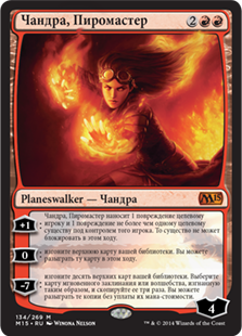 | Rules | +1: Chandra, Pyromaster deals 1 damage to target player or planeswalker and 1 damage to up to one target creature that player or that planeswalker's controller controls. That creature can't block this turn. 0: Exile the top card of your library. You may play it this turn. −7: Exile the top ten cards of your library. Choose an instant or sorcery card exiled this way and copy it three times. You may cast the copies without paying their mana costs. |