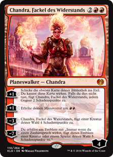 | Rules | +1: Exile the top card of your library. You may cast that card. If you don't, Chandra, Torch of Defiance deals 2 damage to each opponent. +1: Add . −3: Chandra, Torch of Defiance deals 4 damage to target creature. −7: You get an emblem with "Whenever you cast a spell, this emblem deals 5 damage to any target." |