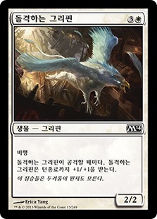 | Rules | Flying (This creature can't be blocked except by creatures with flying or reach.) Whenever Charging Griffin attacks, it gets +1/+1 until end of turn. |