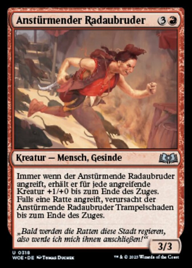 | Rules | Whenever Charging Hooligan attacks, it gets +1/+0 until end of turn for each attacking creature. If a Rat is attacking, Charging Hooligan gains trample until end of turn. |