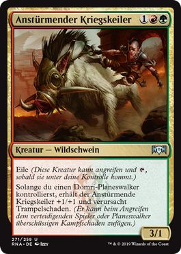 | Rules | Haste (This creature can attack and as soon as it comes under your control.) As long as you control a Domri planeswalker, Charging War Boar gets +1/+1 and has trample. (It can deal excess damage to the player or planeswalker it's attacking.) |
