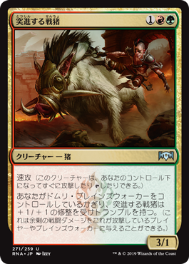As long as you control a Domri planeswalker, Charging War Boar gets +1/+1 and has trample. (It can deal excess damage to the player or planeswalker it's attacking.)