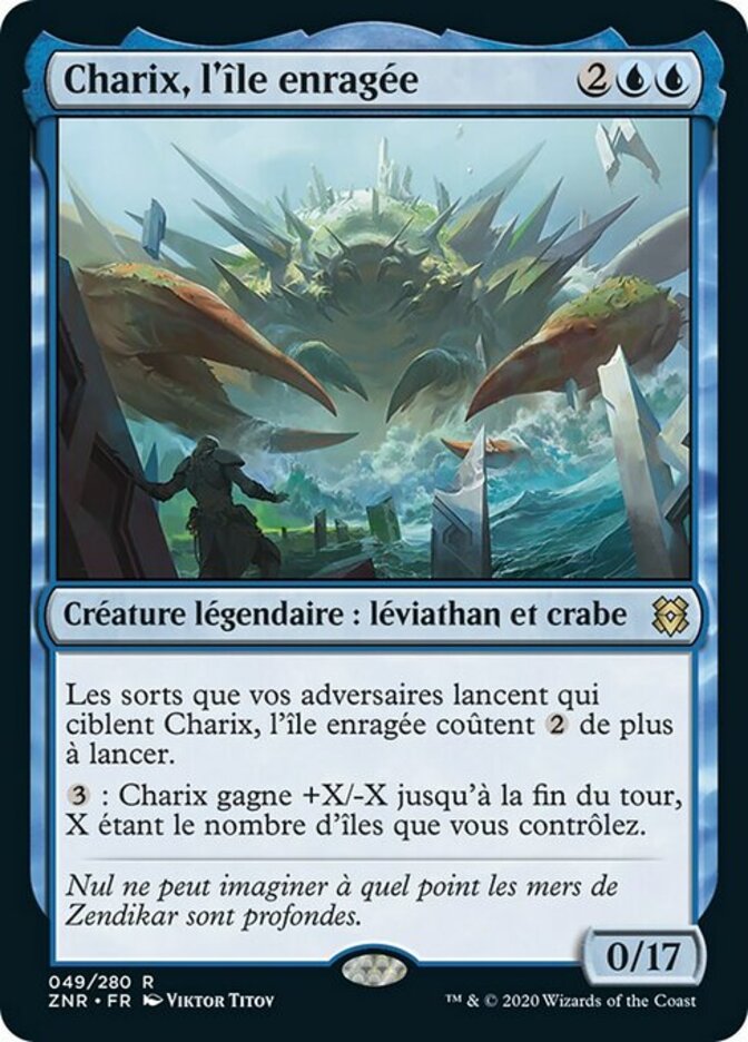 | Rules | Spells your opponents cast that target Charix, the Raging Isle cost more to cast. : Charix gets +X/-X until end of turn, where X is the number of Islands you control. |