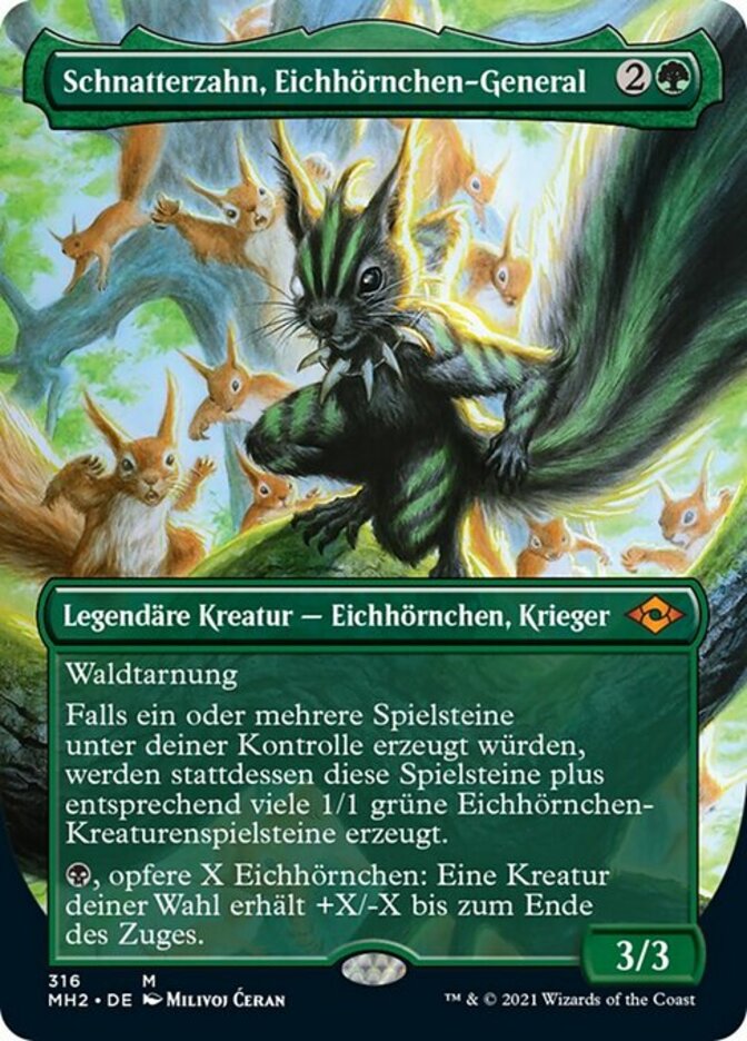 | Rules | Forestwalk (This creature can't be blocked as long as defending player controls a Forest.) If one or more tokens would be created under your control, those tokens plus that many 1/1 green Squirrel creature tokens are created instead. , Sacrifice X Squirrels: Target creature gets +X/-X until end of turn. |