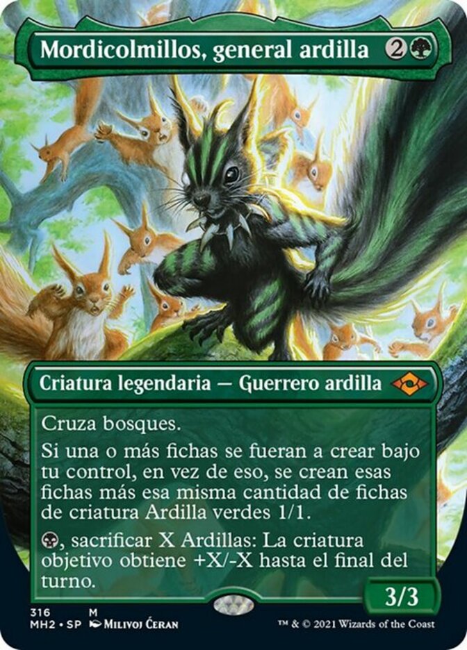 | Rules | Forestwalk (This creature can't be blocked as long as defending player controls a Forest.) If one or more tokens would be created under your control, those tokens plus that many 1/1 green Squirrel creature tokens are created instead. , Sacrifice X Squirrels: Target creature gets +X/-X until end of turn. |