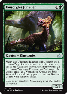| Rules | When Cherished Hatchling dies, you may cast Dinosaur spells this turn as though they had flash, and whenever you cast a Dinosaur spell this turn, it gains "When this creature enters the battlefield, you may have it fight another target creature." |