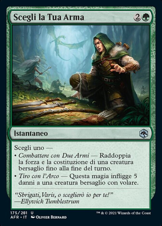 | Rules | Choose one — • Two-Weapon Fighting — Double target creature's power and toughness until end of turn. • Archery — This spell deals 5 damage to target creature with flying. |