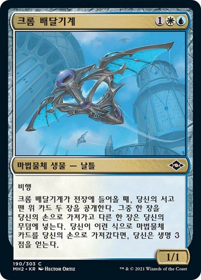 | Rules | Flying When Chrome Courier enters the battlefield, reveal the top two cards of your library. Put one of them into your hand and the other into your graveyard. If you put an artifact card into your hand this way, you gain 3 life. |