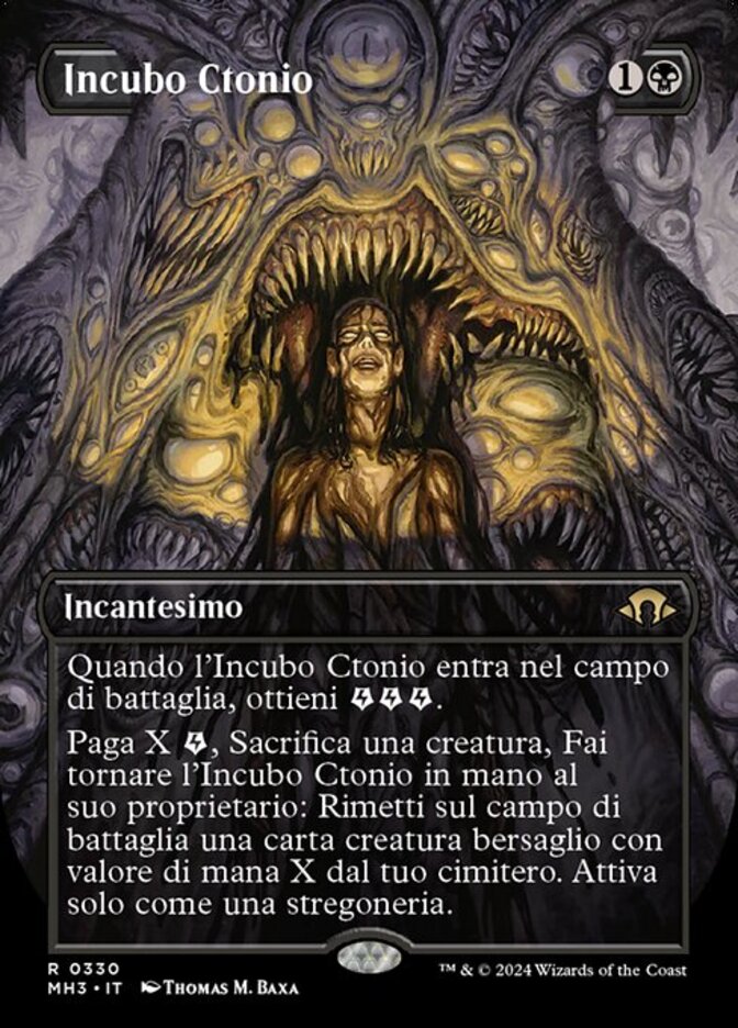 | Rules | When Chthonian Nightmare enters the battlefield, you get (three energy counters). Pay X , Sacrifice a creature, Return Chthonian Nightmare to its owner's hand: Return target creature card with mana value X from your graveyard to the battlefield. Activate only as a sorcery. |