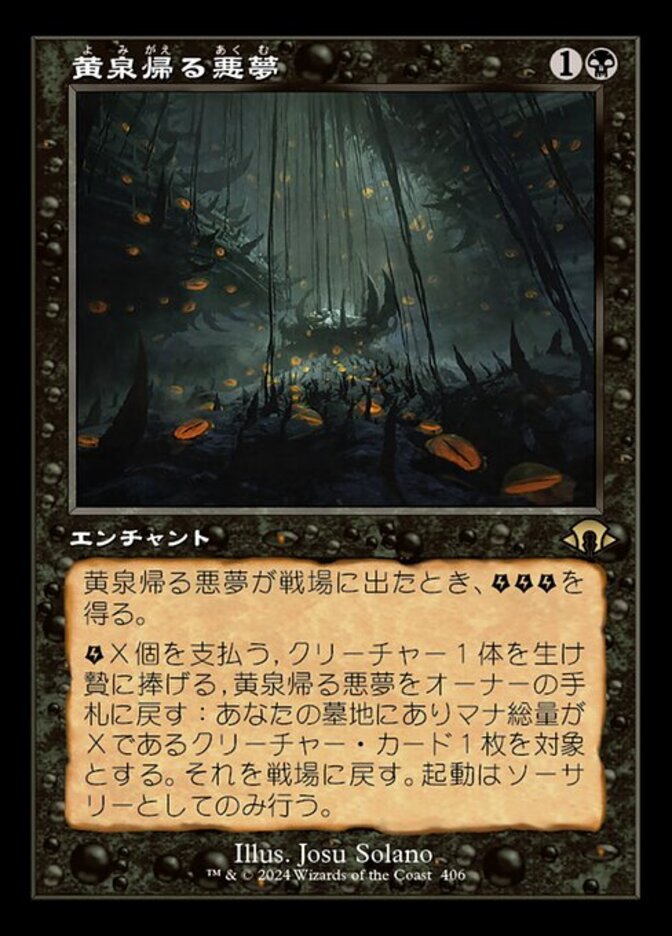| Rules | When Chthonian Nightmare enters the battlefield, you get (three energy counters). Pay X , Sacrifice a creature, Return Chthonian Nightmare to its owner's hand: Return target creature card with mana value X from your graveyard to the battlefield. Activate only as a sorcery. |