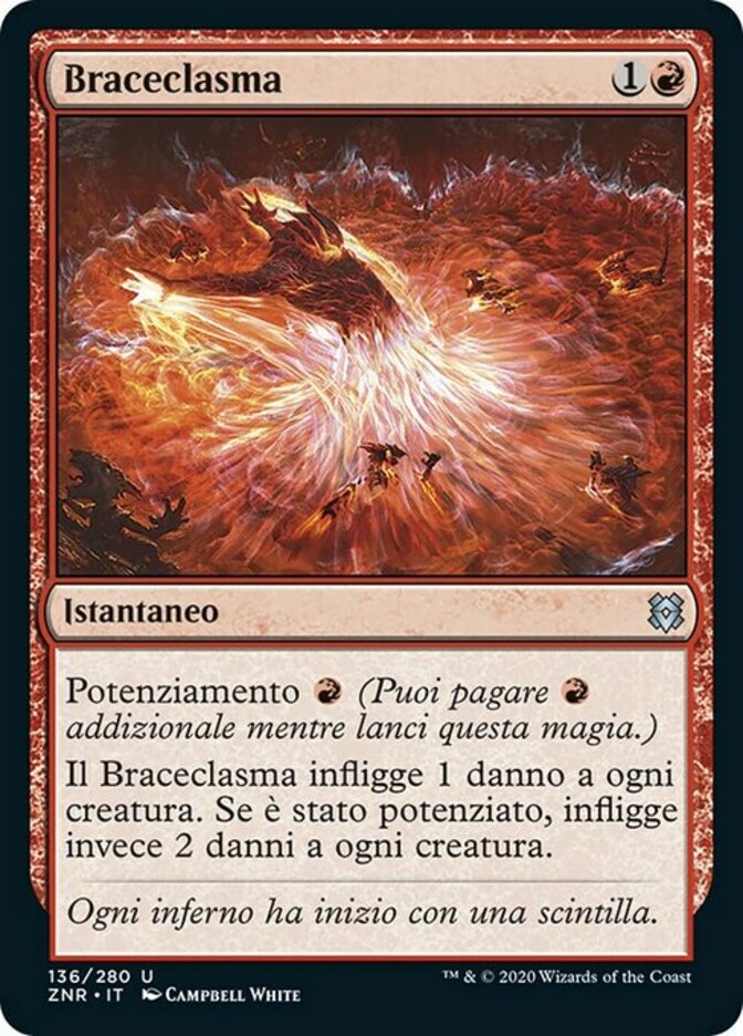| Rules | Kicker (You may pay an additional as you cast this spell.) Cinderclasm deals 1 damage to each creature. If it was kicked, it deals 2 damage to each creature instead. |