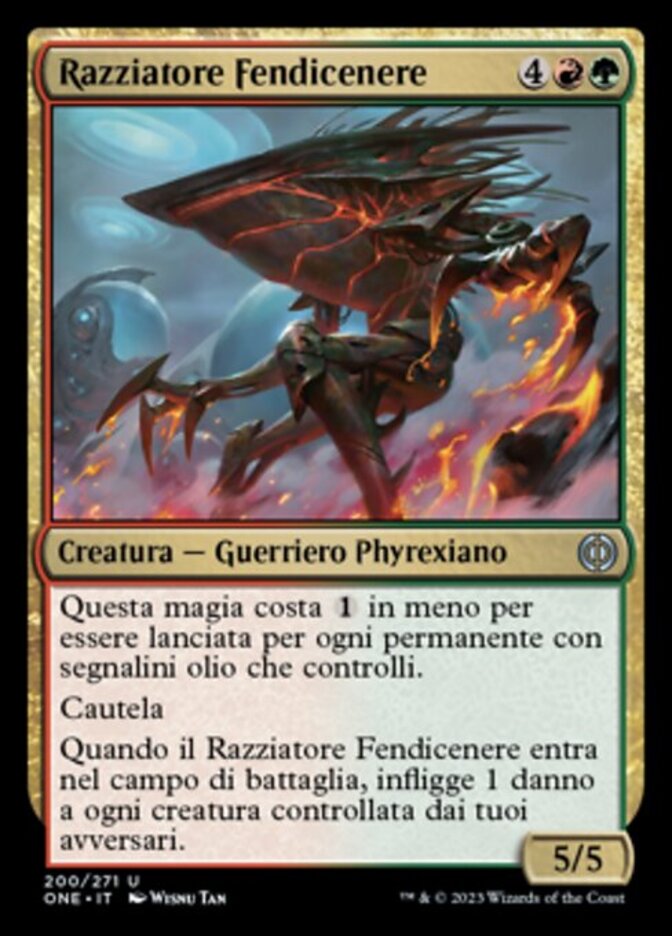 | Rules | This spell costs less to cast for each permanent you control with oil counters on it. Vigilance When Cinderslash Ravager enters the battlefield, it deals 1 damage to each creature your opponents control. |