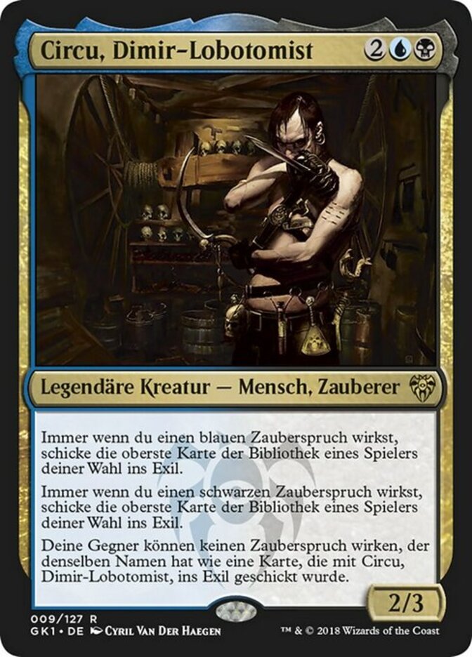 | Rules | Whenever you cast a blue spell, exile the top card of target player's library. Whenever you cast a black spell, exile the top card of target player's library. Your opponents can't cast spells with the same name as a card exiled with Circu, Dimir Lobotomist. |
