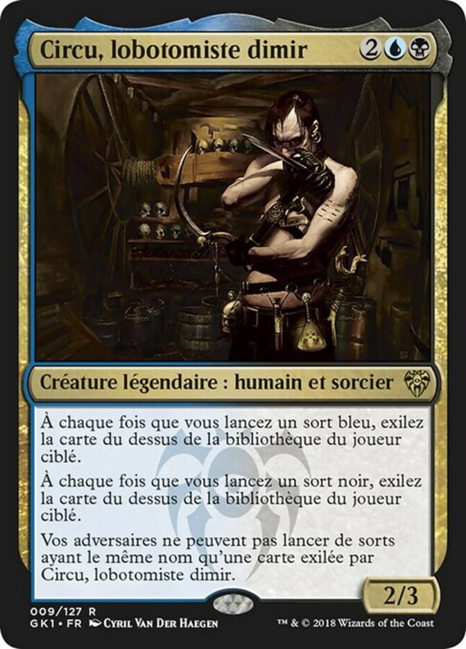 | Rules | Whenever you cast a blue spell, exile the top card of target player's library. Whenever you cast a black spell, exile the top card of target player's library. Your opponents can't cast spells with the same name as a card exiled with Circu, Dimir Lobotomist. |