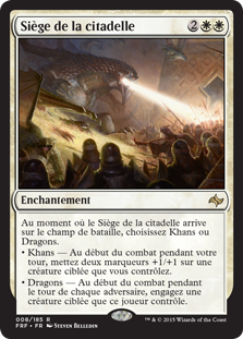 | Rules | As Citadel Siege enters the battlefield, choose Khans or Dragons. • Khans — At the beginning of combat on your turn, put two +1/+1 counters on target creature you control. • Dragons — At the beginning of combat on each opponent's turn, tap target creature that player controls. |