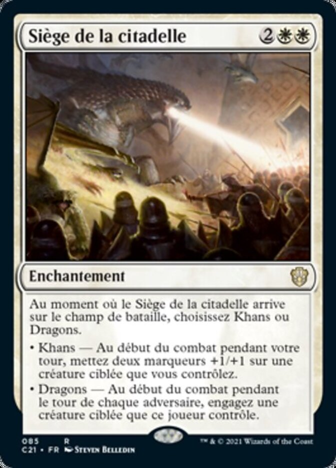 | Rules | As Citadel Siege enters the battlefield, choose Khans or Dragons. • Khans — At the beginning of combat on your turn, put two +1/+1 counters on target creature you control. • Dragons — At the beginning of combat on each opponent's turn, tap target creature that player controls. |