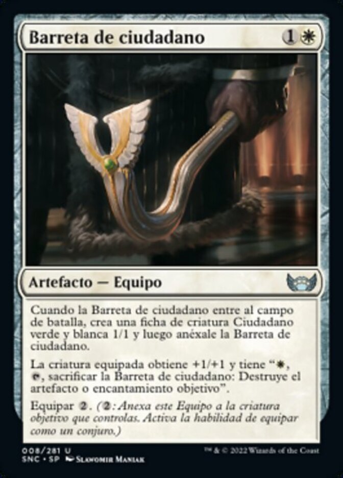 | Rules | When Citizen's Crowbar enters the battlefield, create a 1/1 green and white Citizen creature token, then attach Citizen's Crowbar to it. Equipped creature gets +1/+1 and has ", , Sacrifice Citizen's Crowbar: Destroy target artifact or enchantment." Equip (: Attach to target creature you control. Equip only as a sorcery.) |