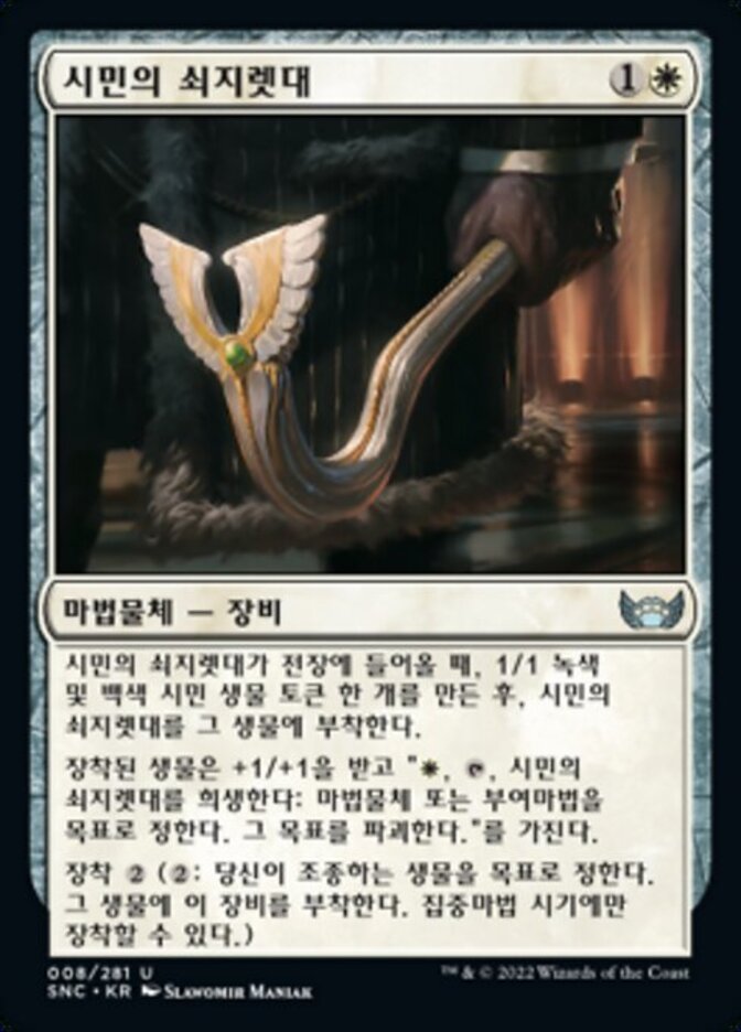 | Rules | When Citizen's Crowbar enters the battlefield, create a 1/1 green and white Citizen creature token, then attach Citizen's Crowbar to it. Equipped creature gets +1/+1 and has ", , Sacrifice Citizen's Crowbar: Destroy target artifact or enchantment." Equip (: Attach to target creature you control. Equip only as a sorcery.) |