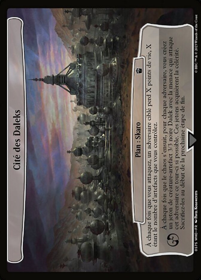 | Rules | Whenever you attack, target opponent loses X life, where X is the number of artifacts you control. Whenever chaos ensues, for each opponent, you create a 3/3 black Dalek artifact creature token with menace that attacks that opponent this turn if able. Those tokens gain haste. Sacrifice them at the beginning of the next end step. |