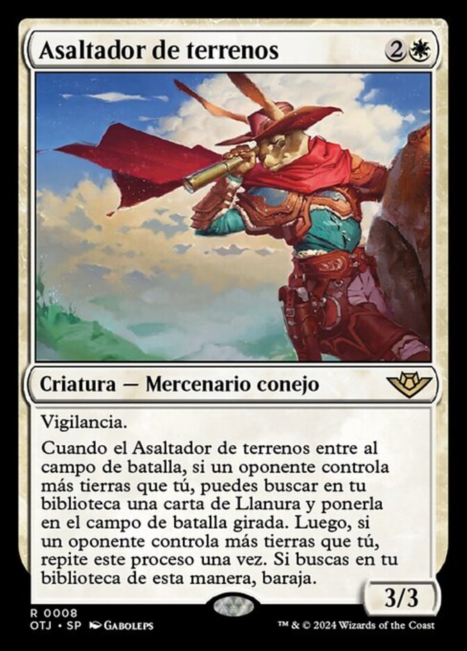 | Rules | Vigilance When Claim Jumper enters the battlefield, if an opponent controls more lands than you, you may search your library for a Plains card and put it onto the battlefield tapped. Then if an opponent controls more lands than you, repeat this process once. If you search your library this way, shuffle. |