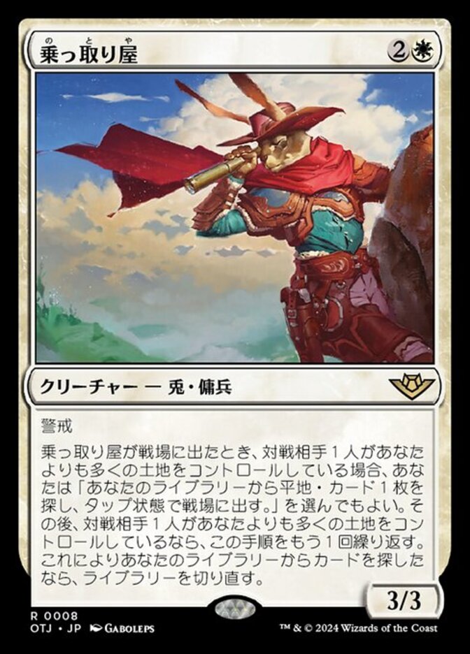 | Rules | Vigilance When Claim Jumper enters the battlefield, if an opponent controls more lands than you, you may search your library for a Plains card and put it onto the battlefield tapped. Then if an opponent controls more lands than you, repeat this process once. If you search your library this way, shuffle. |