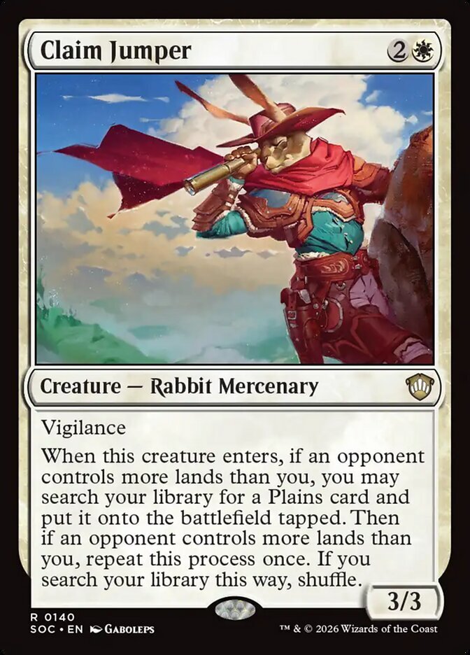 | Rules | Vigilance When Claim Jumper enters the battlefield, if an opponent controls more lands than you, you may search your library for a Plains card and put it onto the battlefield tapped. Then if an opponent controls more lands than you, repeat this process once. If you search your library this way, shuffle. |