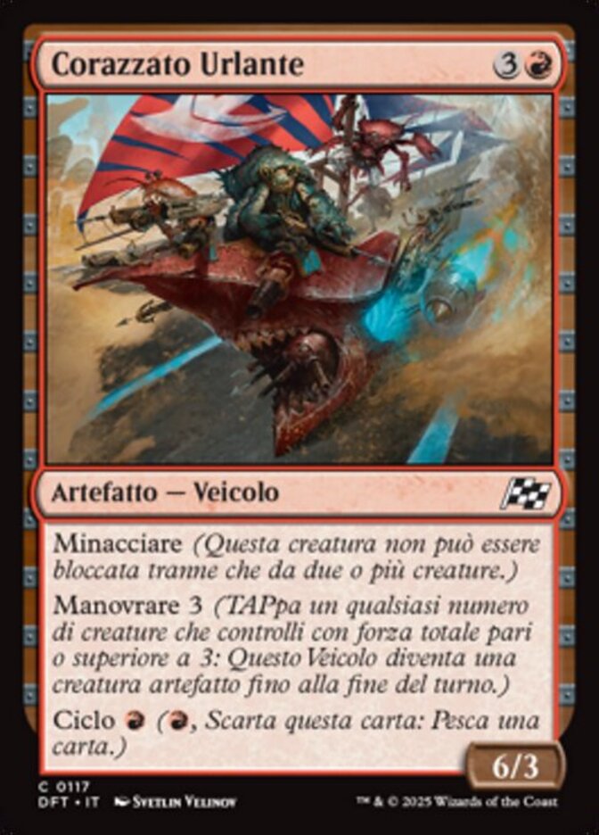 | Rules | Menace (This creature can't be blocked except by two or more creatures.) Crew 3 (Tap any number of creatures you control with total power 3 or more: This Vehicle becomes an artifact creature end of turn.) Cycling (, Discard this card: Draw a card.) |
