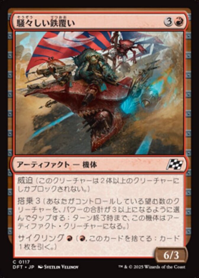| Rules | Menace (This creature can't be blocked except by two or more creatures.) Crew 3 (Tap any number of creatures you control with total power 3 or more: This Vehicle becomes an artifact creature end of turn.) Cycling (, Discard this card: Draw a card.) |