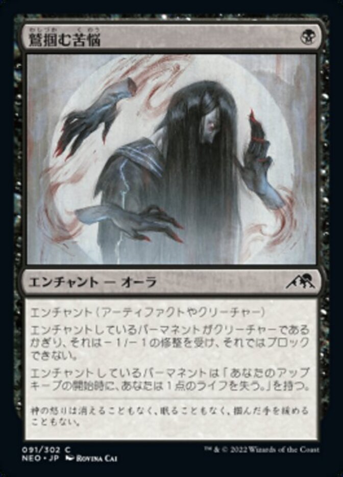 | Rules | Enchant artifact or creature As long as enchanted permanent is a creature, it gets -1/-1 and can't block. Enchanted permanent has "At the beginning of your upkeep, you lose 1 life." |