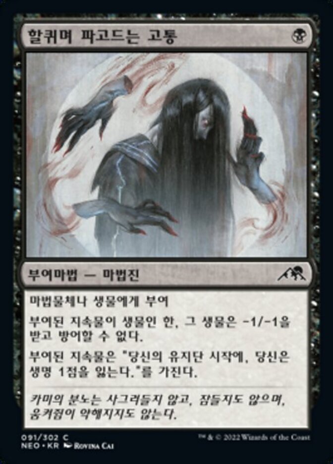 | Rules | Enchant artifact or creature As long as enchanted permanent is a creature, it gets -1/-1 and can't block. Enchanted permanent has "At the beginning of your upkeep, you lose 1 life." |