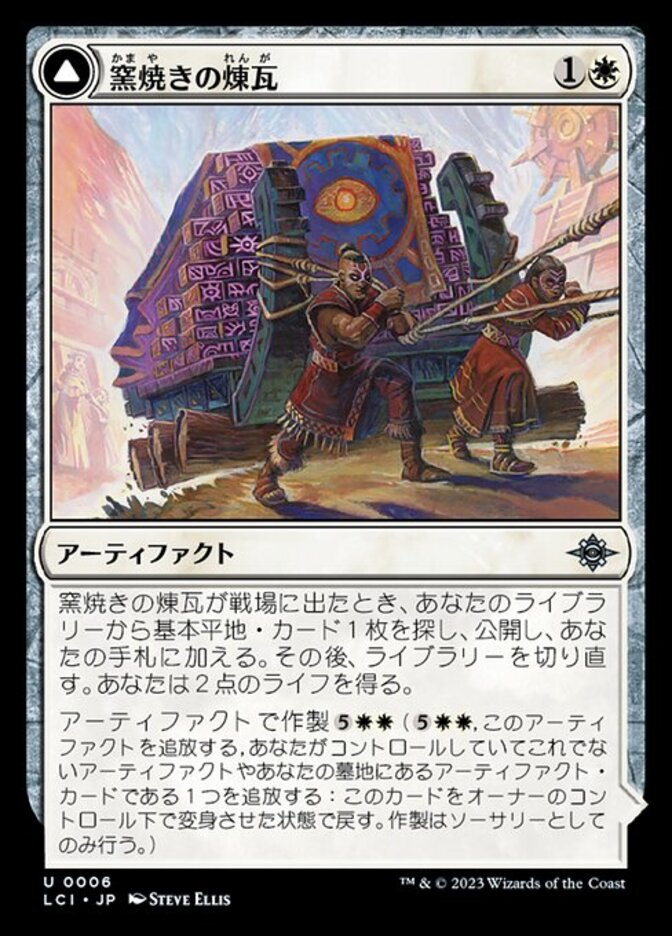 | Rules | When Clay-Fired Bricks enters the battlefield, search your library for a basic Plains card, reveal it, put it into your hand, then shuffle. You gain 2 life. Craft with artifact (, Exile this artifact, Exile another artifact you control or an artifact card from your graveyard: Return this card transformed under its owner's control. Craft only as a sorcery.) // When Cosmium Kiln enters the battlefield, create two 1/1 colorless Gnome artifact creature tokens. Creatures you control get +1/+1. |