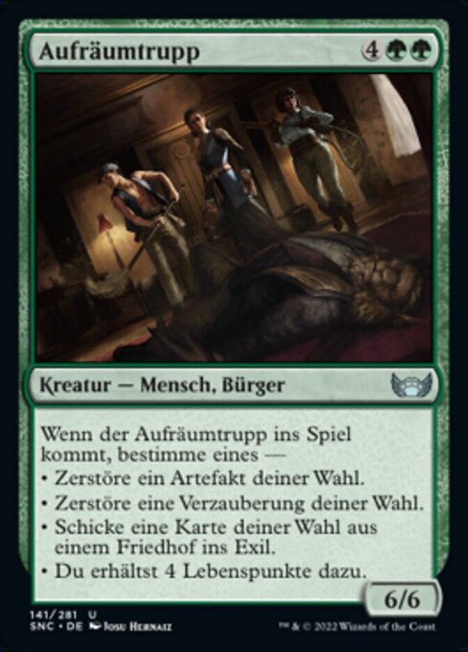 | Rules | When Cleanup Crew enters the battlefield, choose one — • Destroy target artifact. • Destroy target enchantment. • Exile target card from a graveyard. • You gain 4 life. |