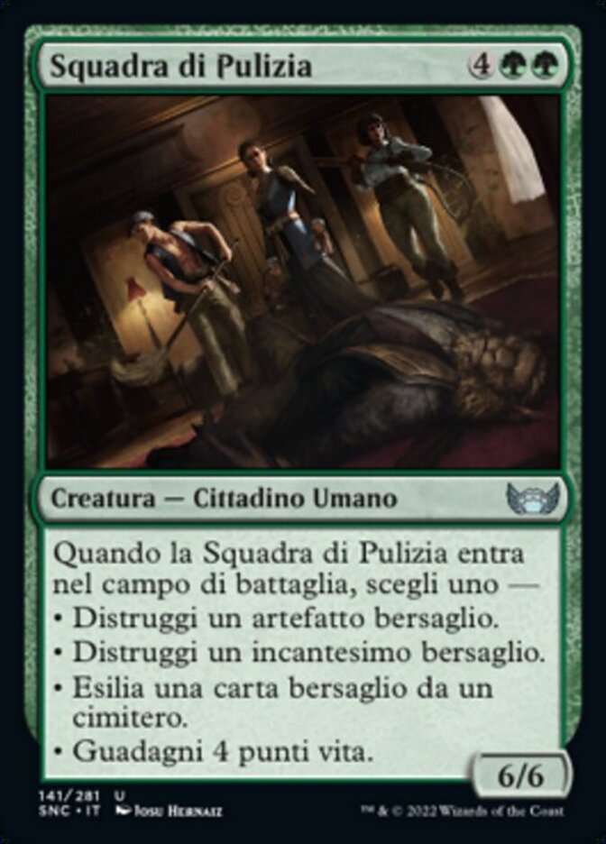 | Rules | When Cleanup Crew enters the battlefield, choose one — • Destroy target artifact. • Destroy target enchantment. • Exile target card from a graveyard. • You gain 4 life. |