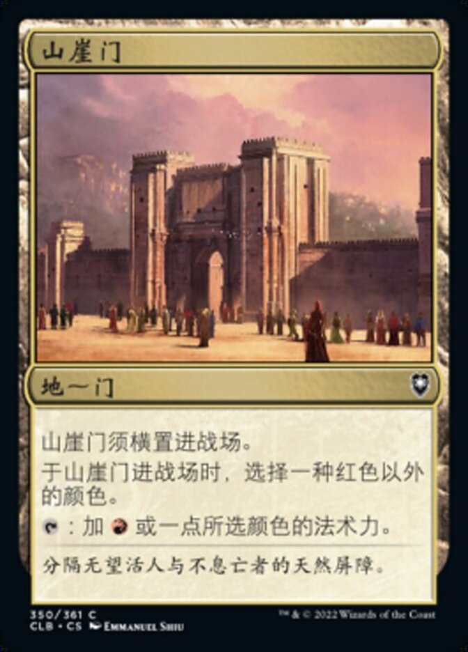 | Rules | Cliffgate enters the battlefield tapped. As Cliffgate enters the battlefield, choose a color other than red. : Add or one mana of the chosen color. |