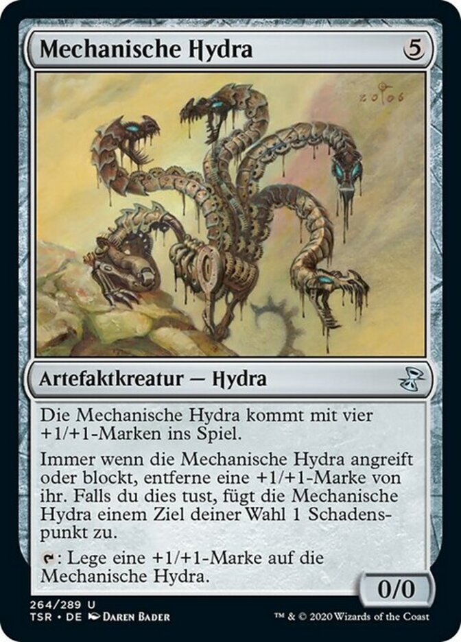 | Rules | Clockwork Hydra enters the battlefield with four +1/+1 counters on it. Whenever Clockwork Hydra attacks or blocks, remove a +1/+1 counter from it. If you do, Clockwork Hydra deals 1 damage to any target. : Put a +1/+1 counter on Clockwork Hydra. |