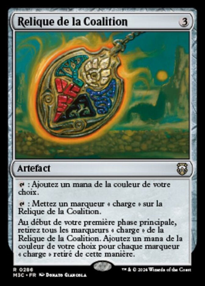 | Rules | : Add one mana of any color. : Put a charge counter on Coalition Relic. At the beginning of your precombat main phase, remove all charge counters from Coalition Relic. Add one mana of any color for each charge counter removed this way. |