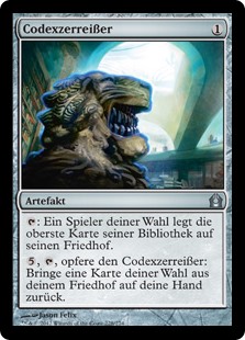 | Rules | : Target player mills a card. (They put the top card of their library into their graveyard.) , , Sacrifice Codex Shredder: Return target card from your graveyard to your hand. |